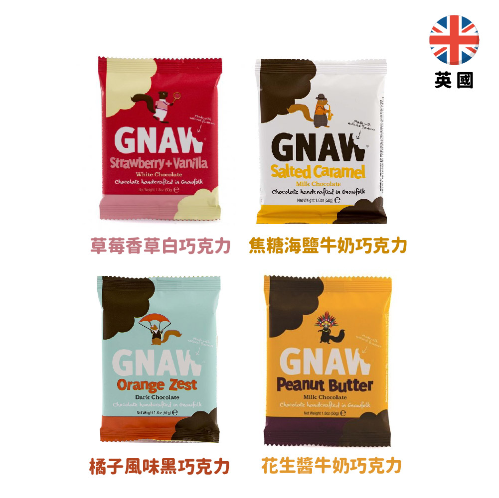 【英國】Gnaw牛奶巧克力-花生醬牛奶巧克力/ 橘子風味黑巧克力/草莓香草白巧克力/焦糖海鹽牛奶巧克力50g