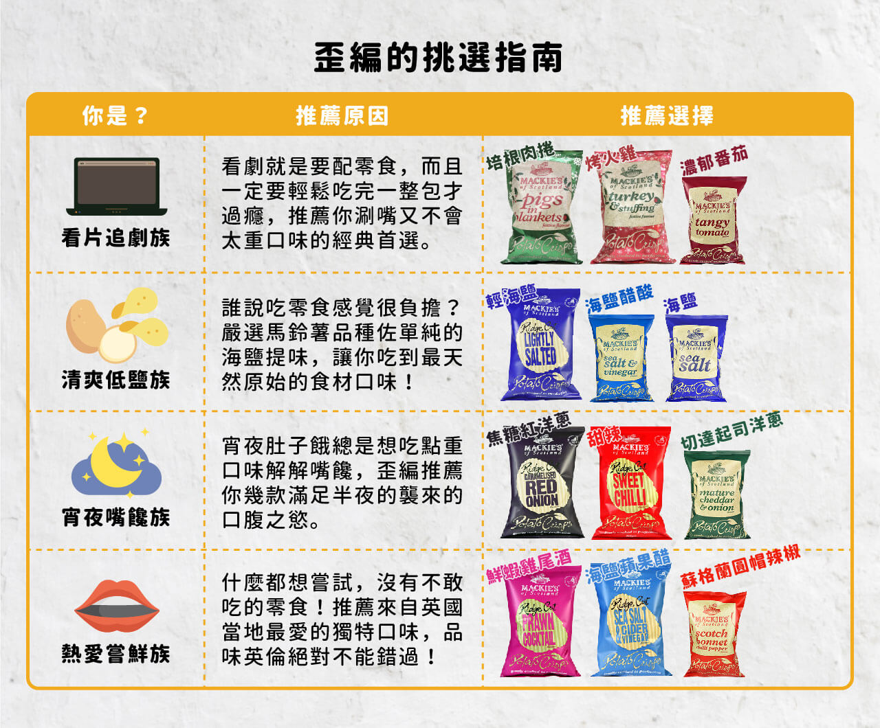 這邊附上歪編精心整理的『MACKIE’S魔脆洋芋片挑選指南』,